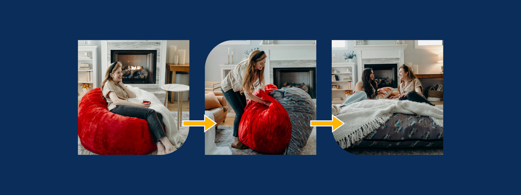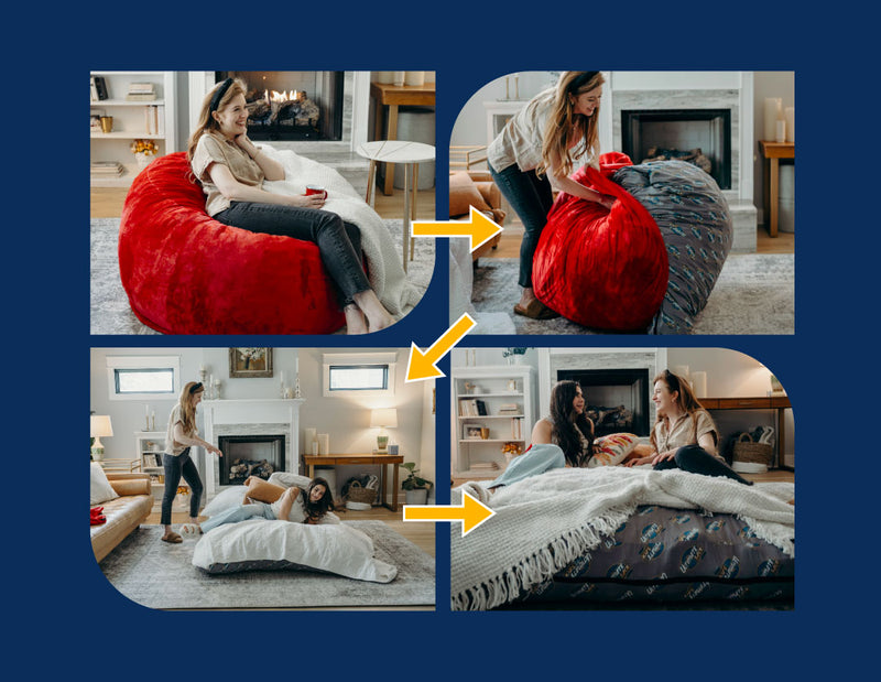 Experience ultimate versatility and comfort with these all new Convertible Bean Bag Chairs! Perfect for any living space, these bean bags effortlessly transform into cozy bed-like pillow, providing both seating and sleeping solutions. Convertible chairs make hosting a breeze! Simply remove the chair-shaping cover to reveal a full, queen, or king mattress inside. Discover the perfect blend of style and functionality with Ultimate Sack's high-quality, durable bean bag chair, designed to enhance your home décor while maximizing comfort.